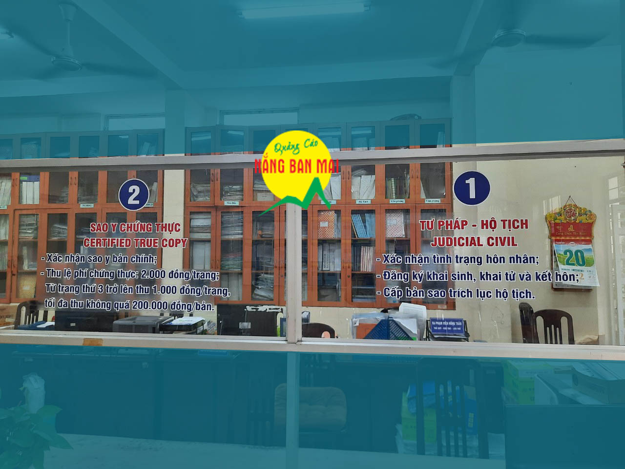 - Dán decal kính cắt chữ màu trắng, nhằm tạo điểm nổi bật ngoài trời.